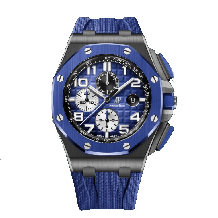 オフショアには明るい色使いが多く見られ、従来のロイヤル オークで見られるセラミックケースのパーペチュアルのように、ホワイトやブラックのセラミックを見ると、未だに二度見してしまうほど驚きがあるかもしれません、しかしこれらのオフショアには、ブルーやグリーンのベゼルやプッシャーが自然に馴染んでいるように見える。
